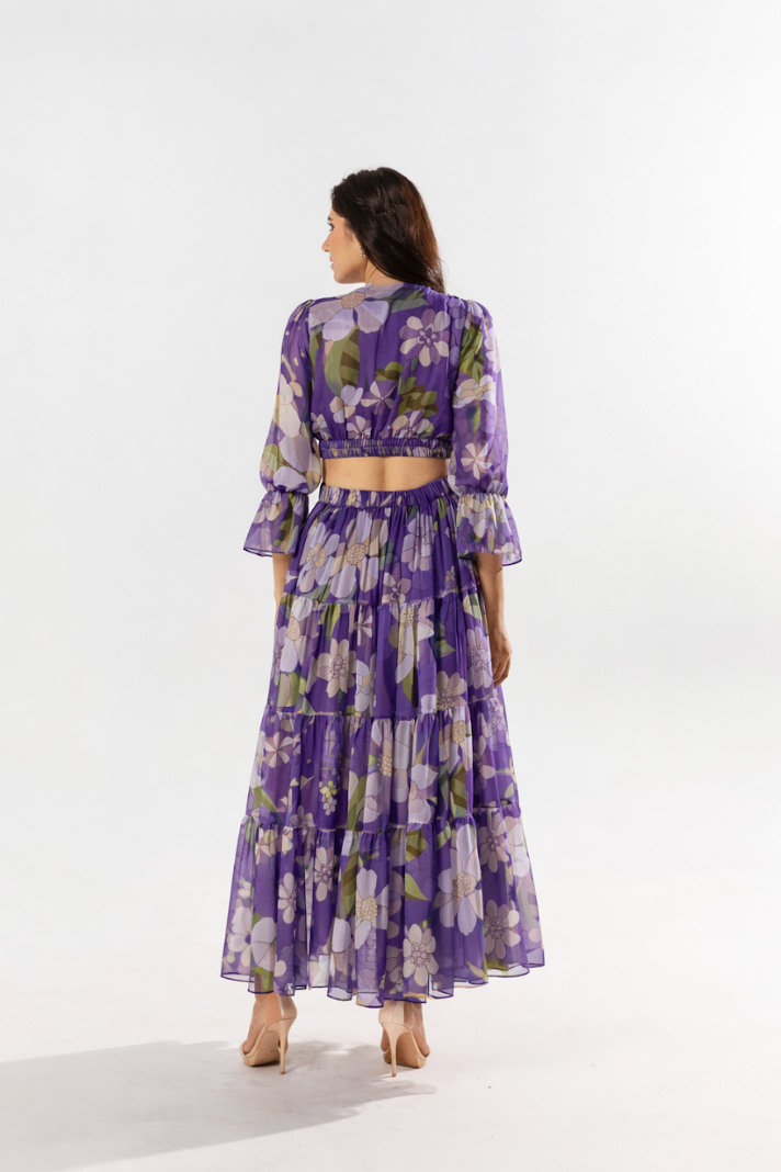 A long dress with V-Neck has easy going flare and a cut-out detail on the waist. Handcrafted with sustainable chiffon fabric in our Kate print.