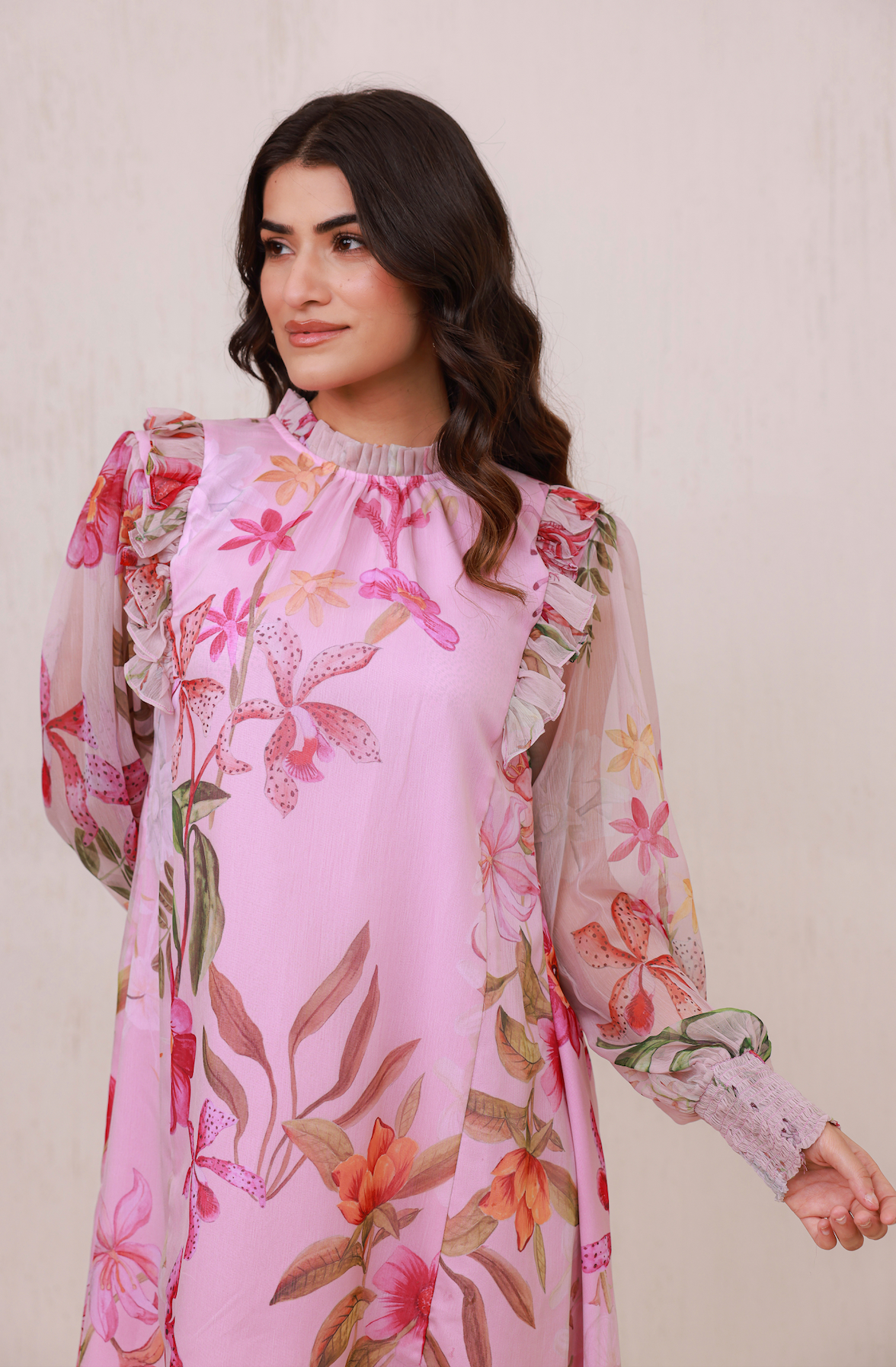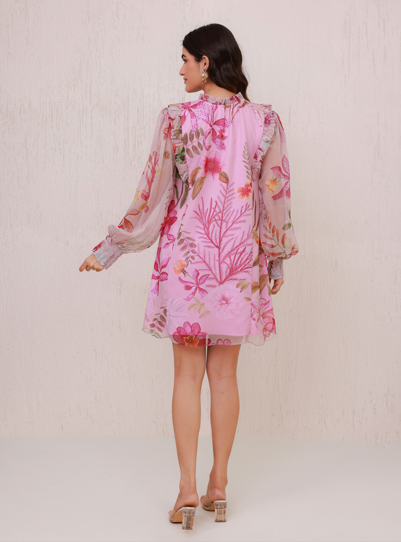 A vibrant floral mini dress in soft pink, featuring ruffle accenets along the bodice and sleeves with pleats on the neckline. It has sheer balloon sleeves with smocked cuff for a playful yet elegant charm.