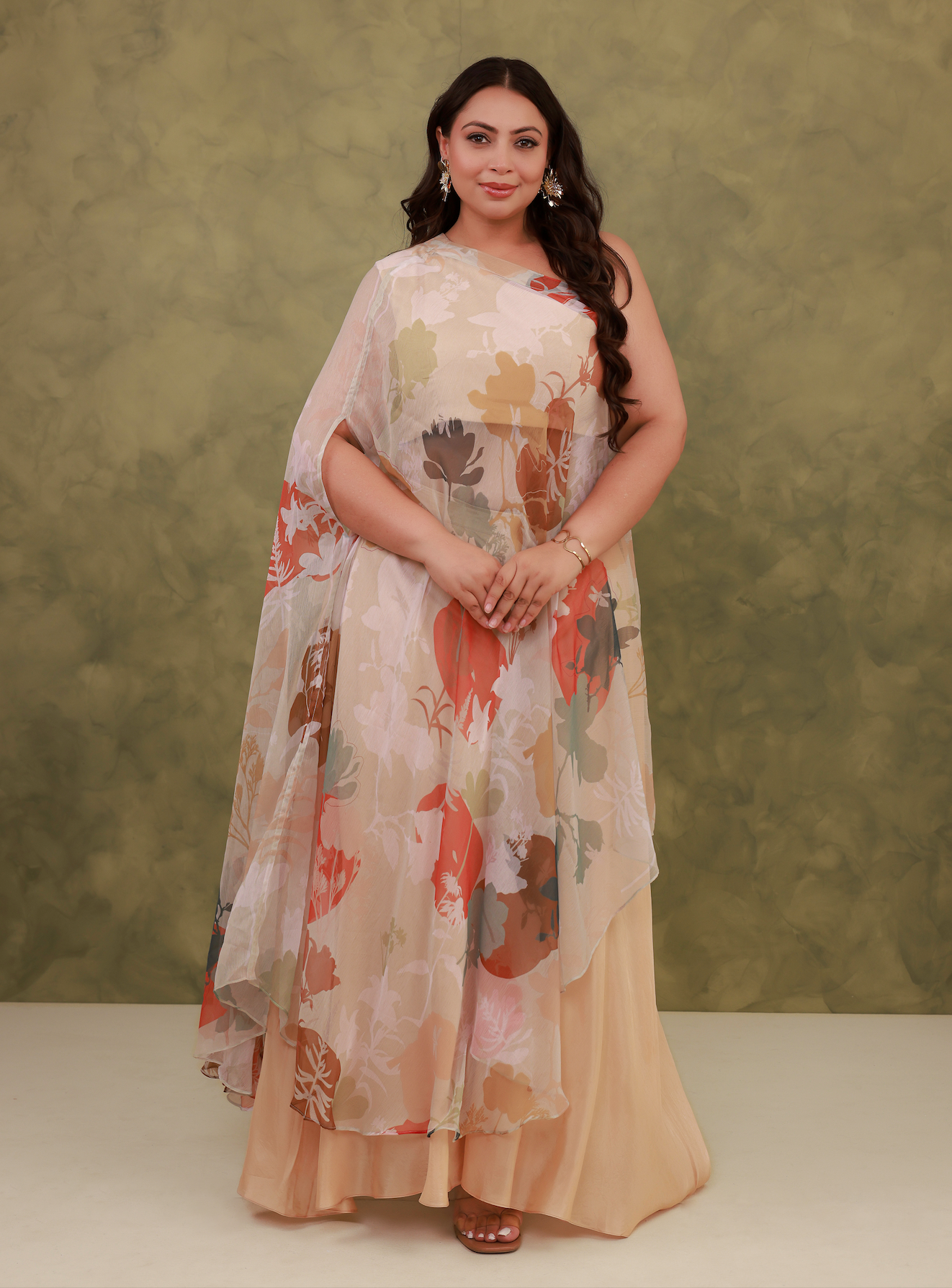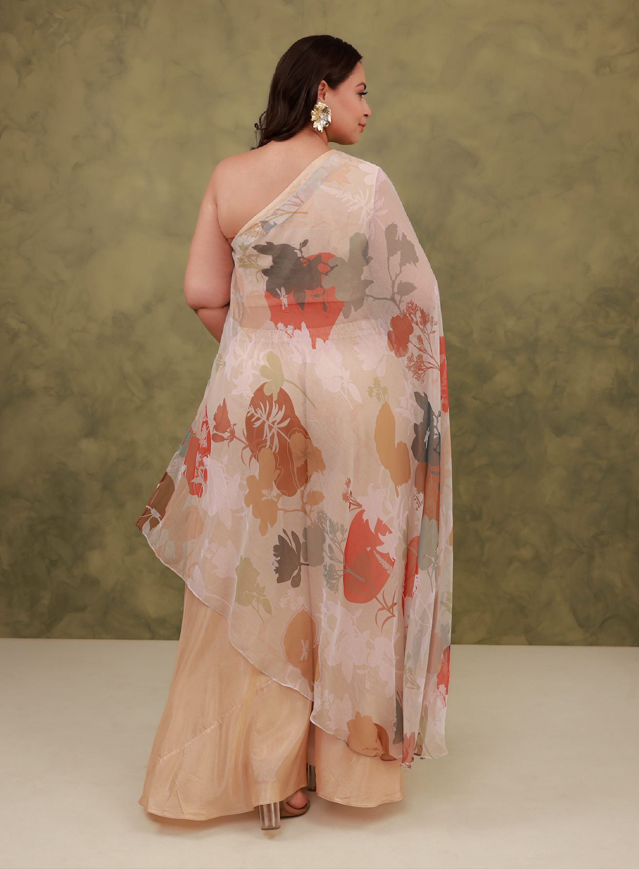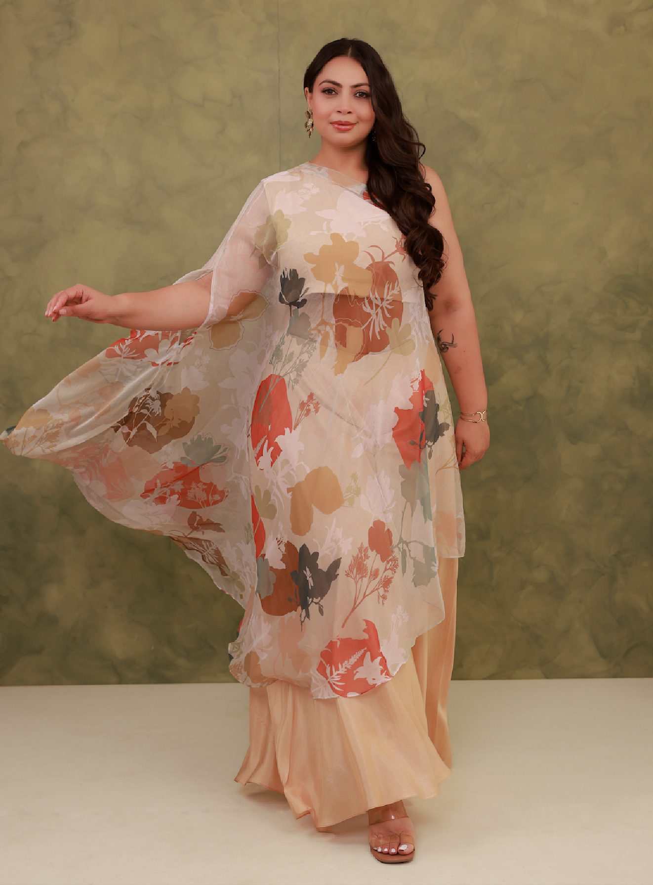 A breezy loose-fit kurta with layered recycled chiffon sleeves, a chic V-neckline, and playful embroidery details-paired with matching print pants for an effortlessly elegant look.