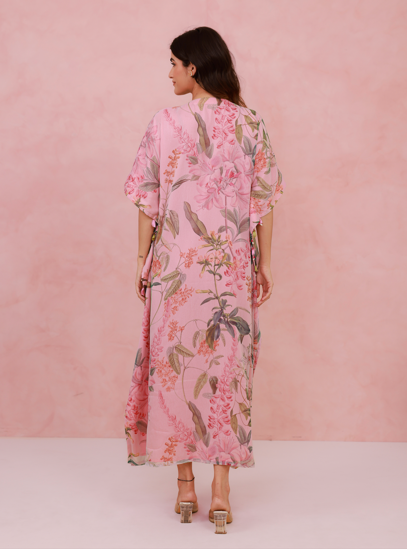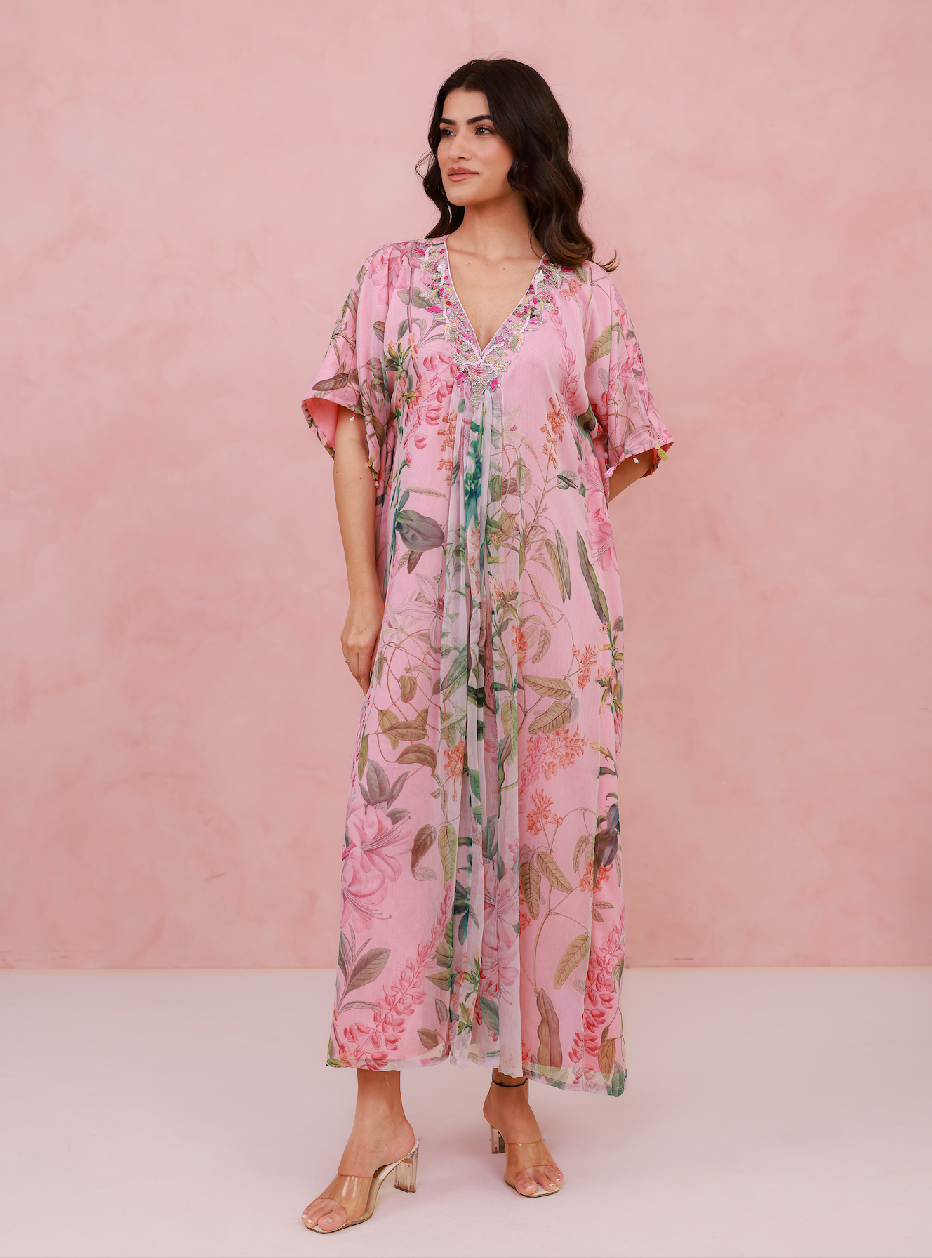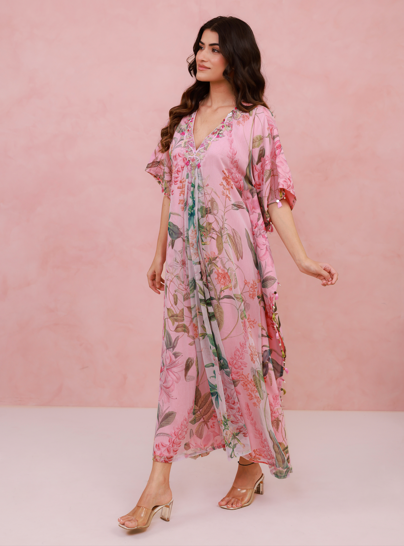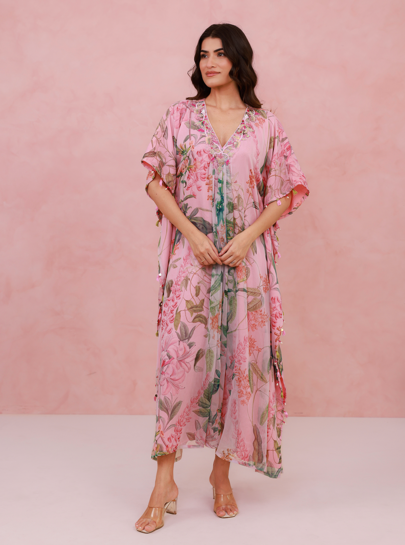 Flowy and effortless, this kaftan features a relaxed silhouette with a delicate hand embroidery over the V-neckline and handmade tassel details, making it perfect for both resort wear and festive evenings.Available in two amazing colors.