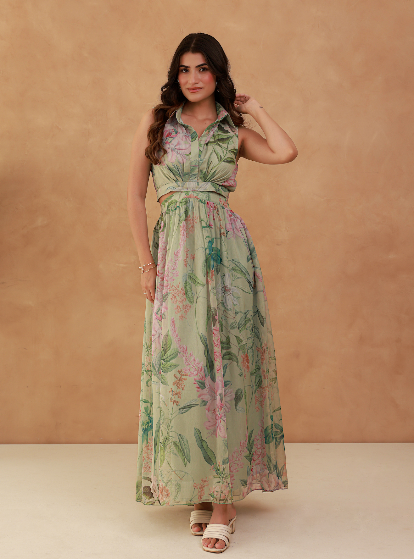 A flowy flared maxi dress featuring a chic collared bodice, playful side cut-outs at the waist, and an elasticated back for the perfect fit. Effortless style meets modern charm.