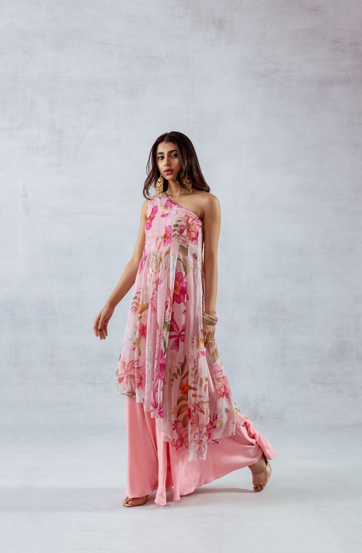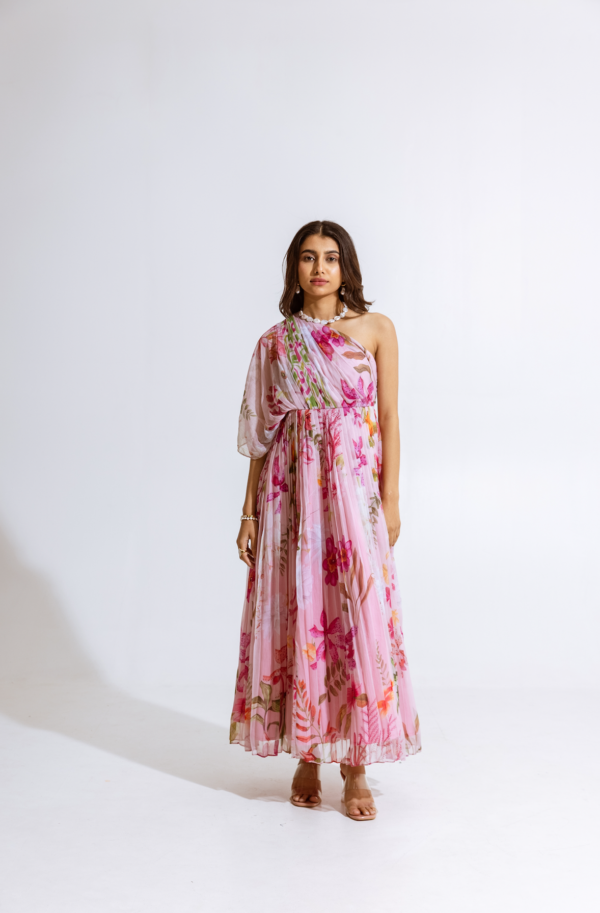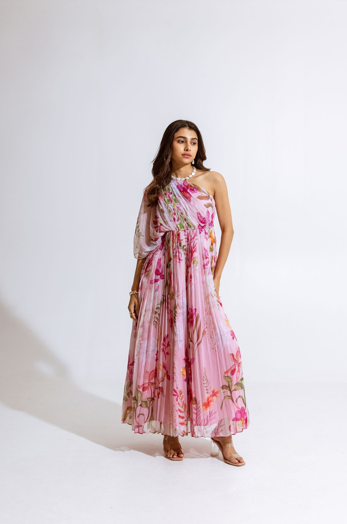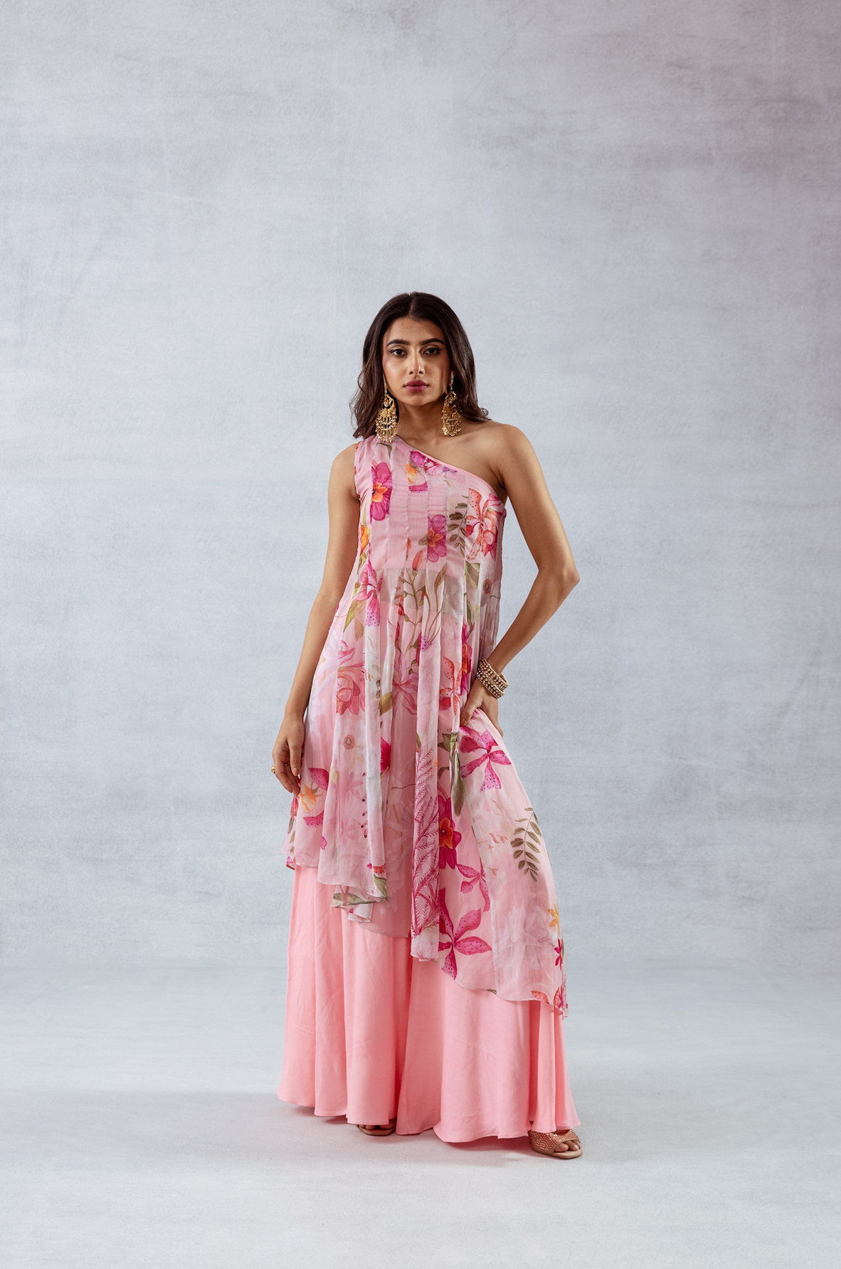 One-shoulder pink pleated asymmetrical top with vibrant floral print, comes with a tube top and flared pants - Perfect for festive celebrations and sundowners.