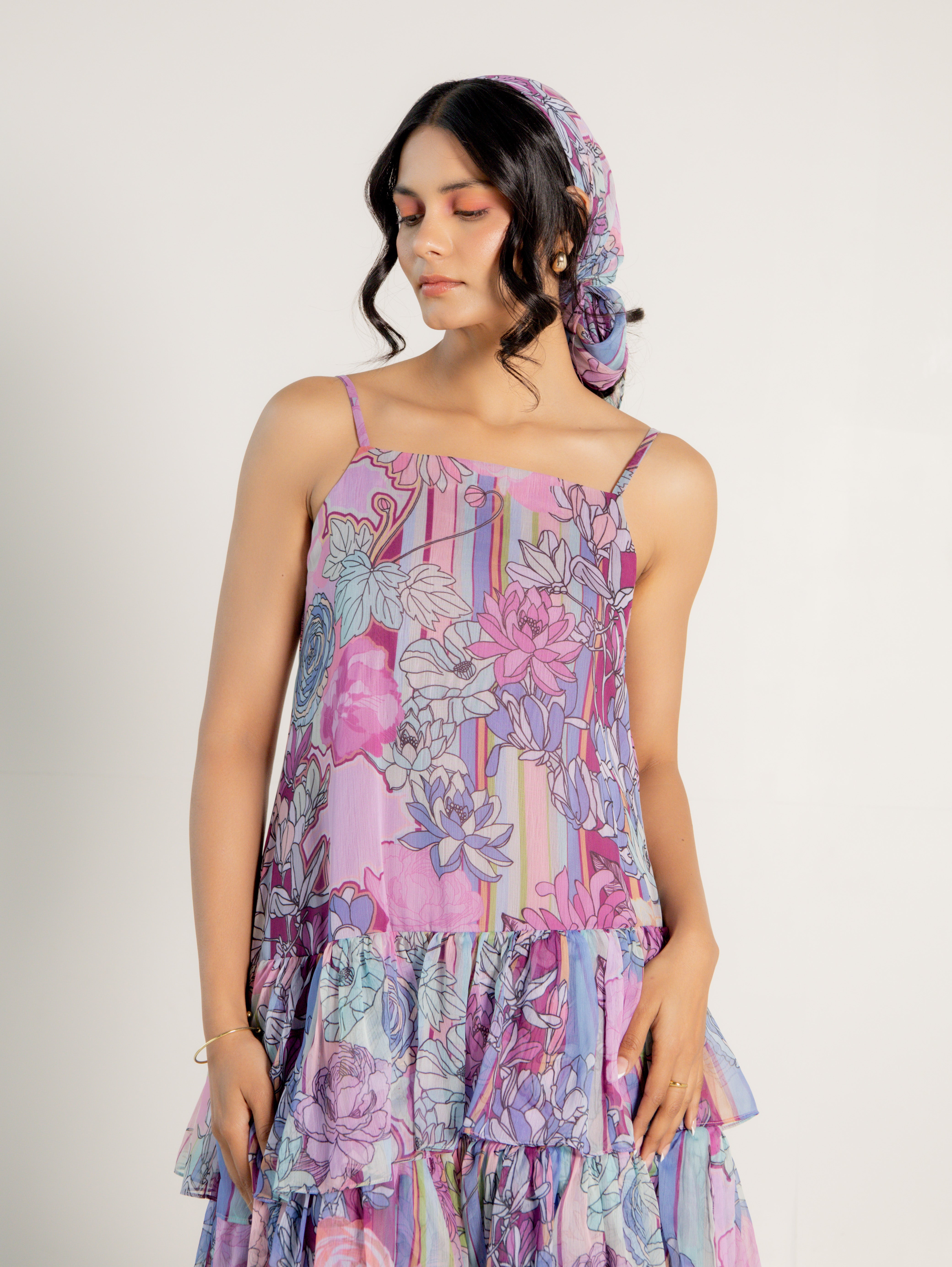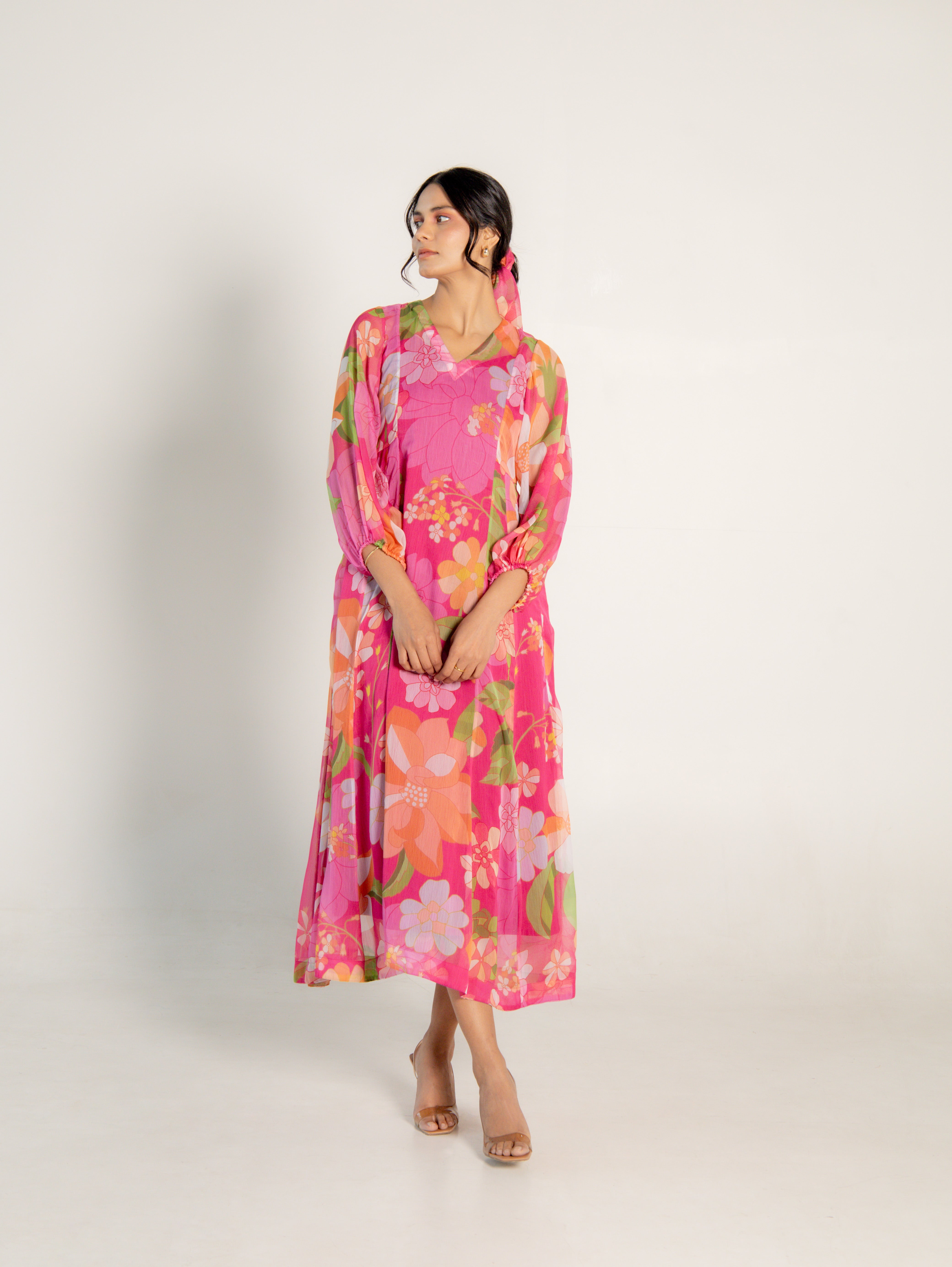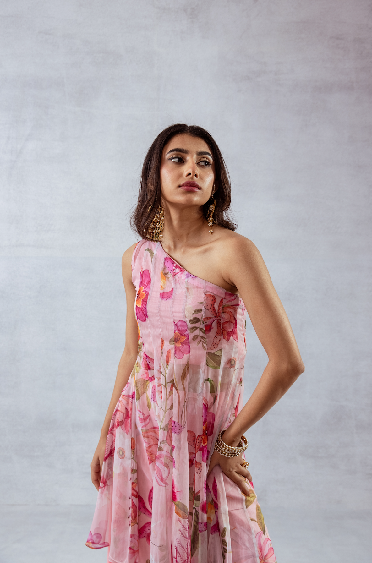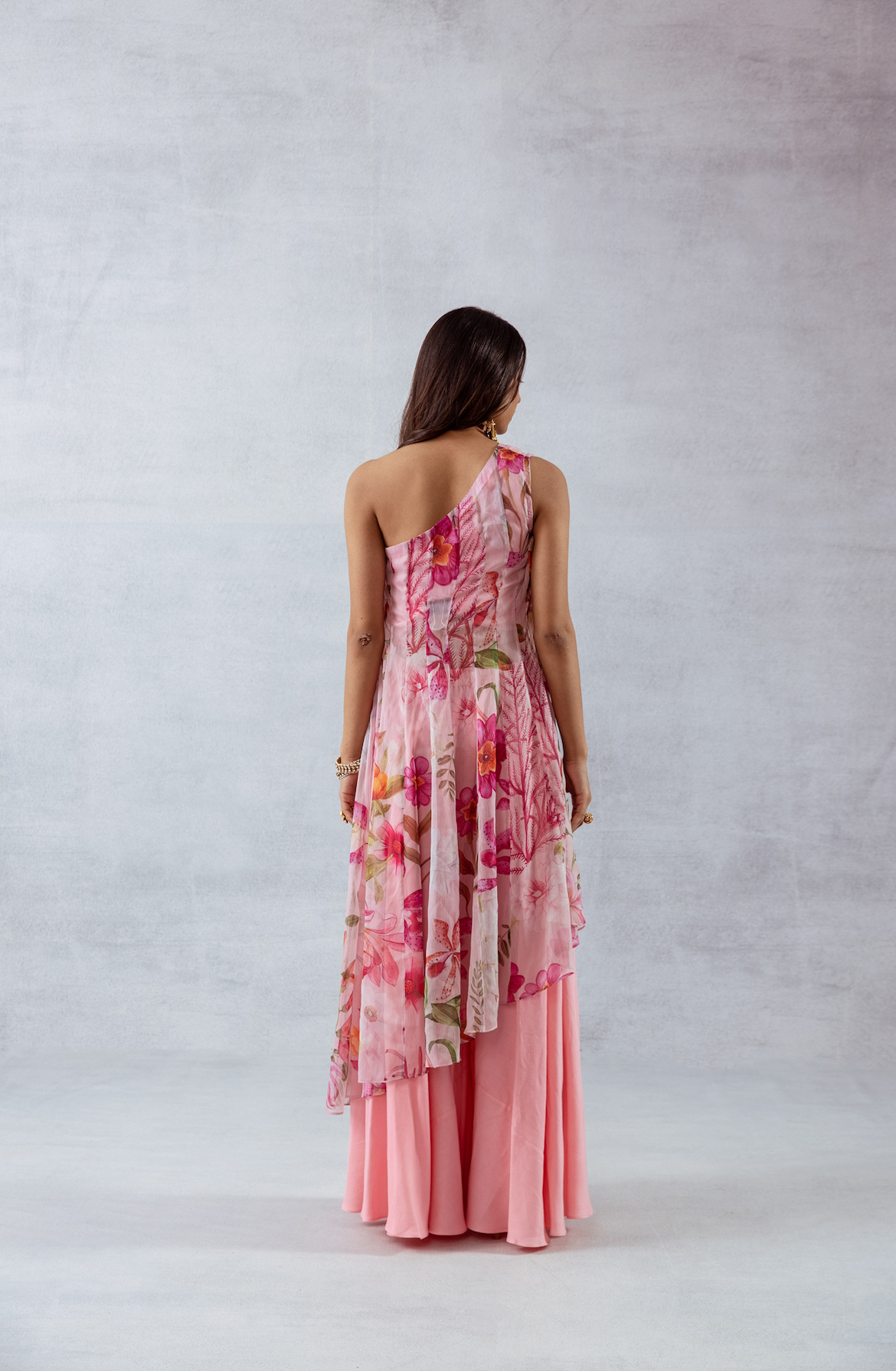 One-shoulder pink pleated asymmetrical top with vibrant floral print, comes with a tube top and flared pants - Perfect for festive celebrations and sundowners.