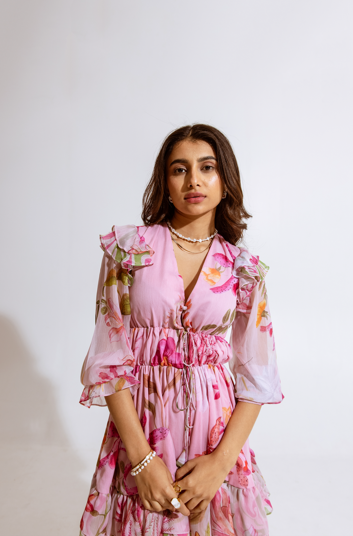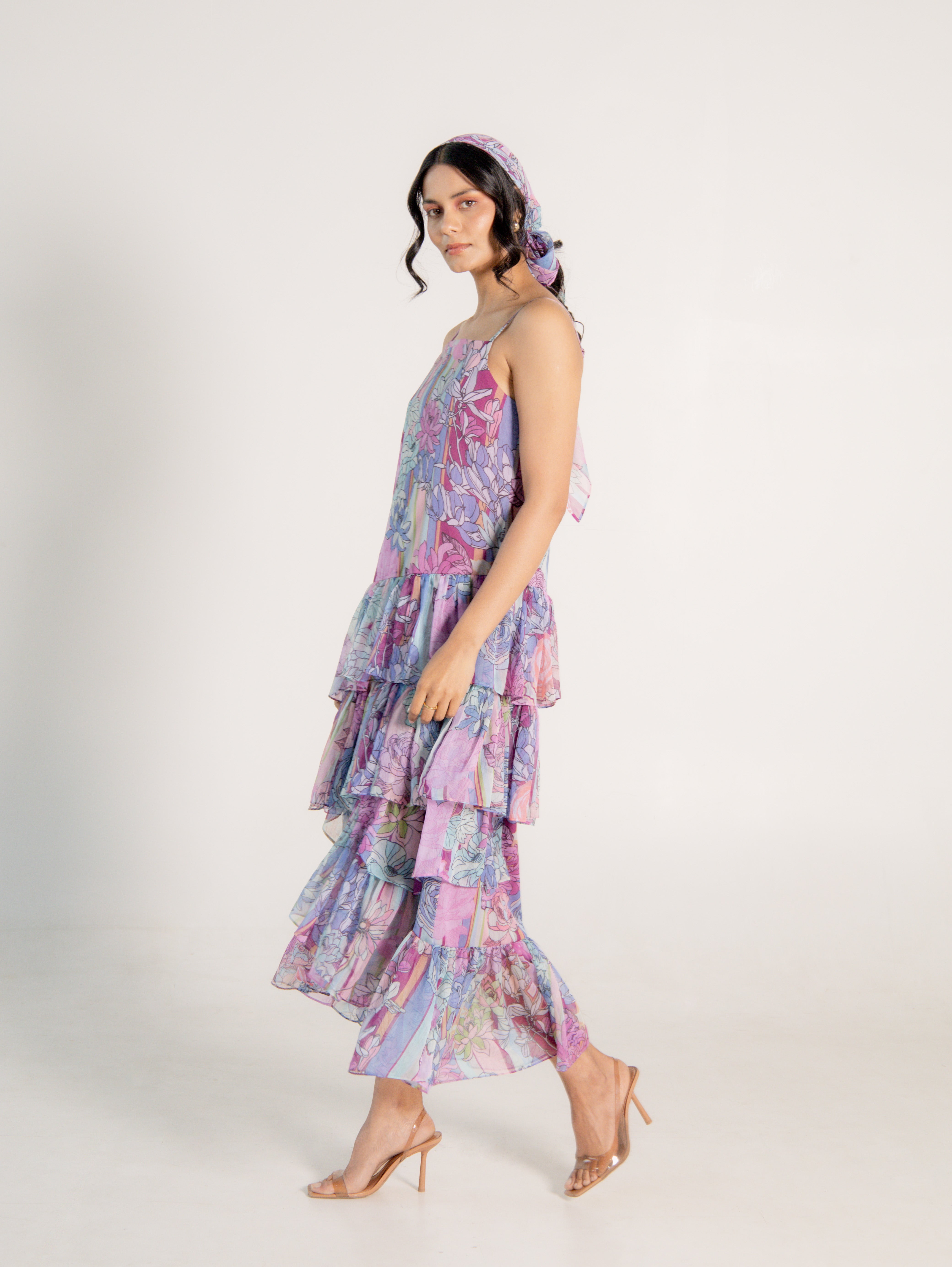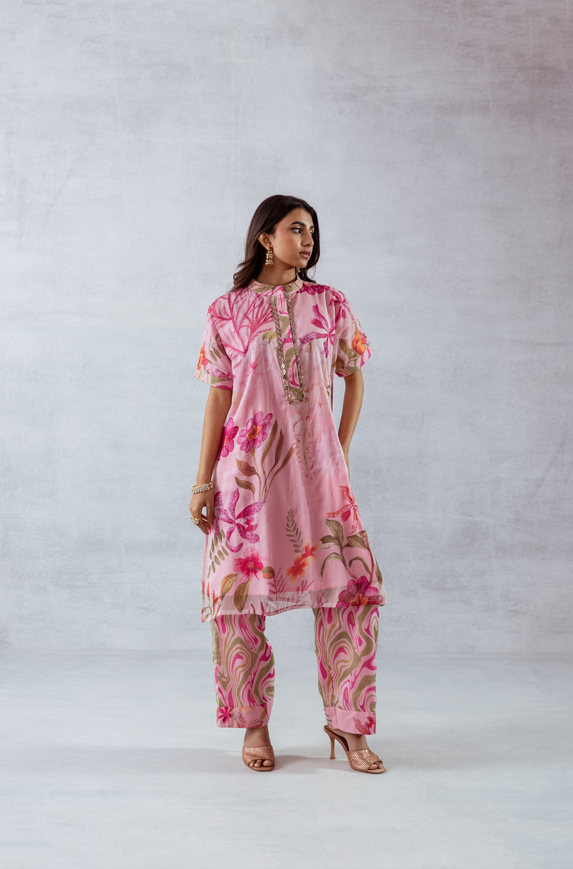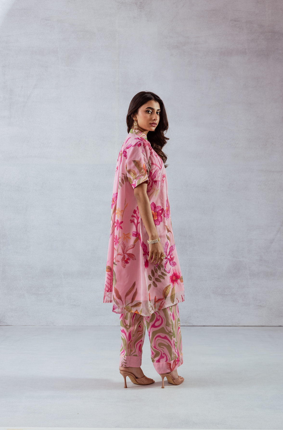 One-shoulder pink pleated asymmetrical top with vibrant floral print, comes with a tube top and flared pants - Perfect for festive celebrations and sundowners.