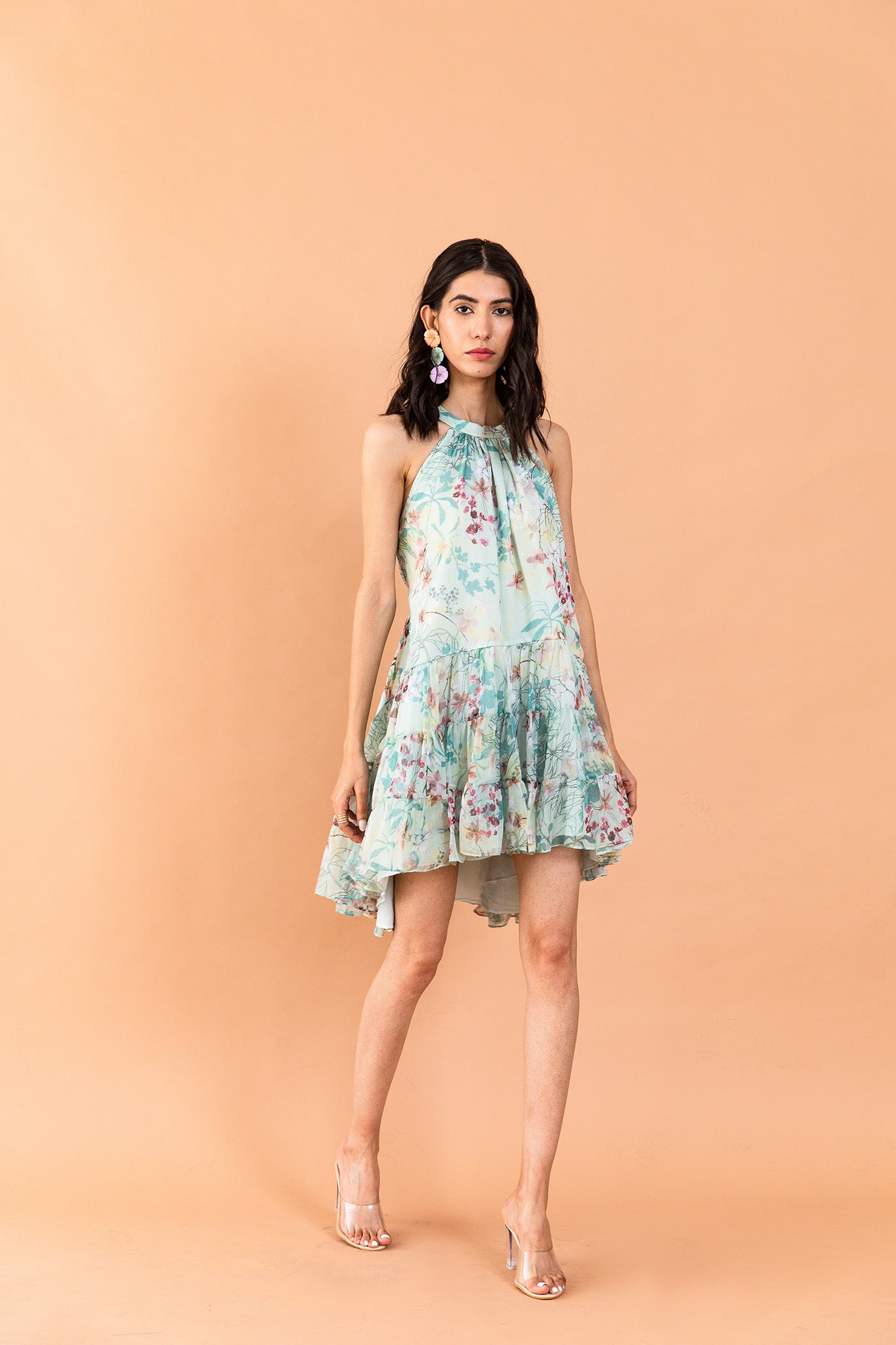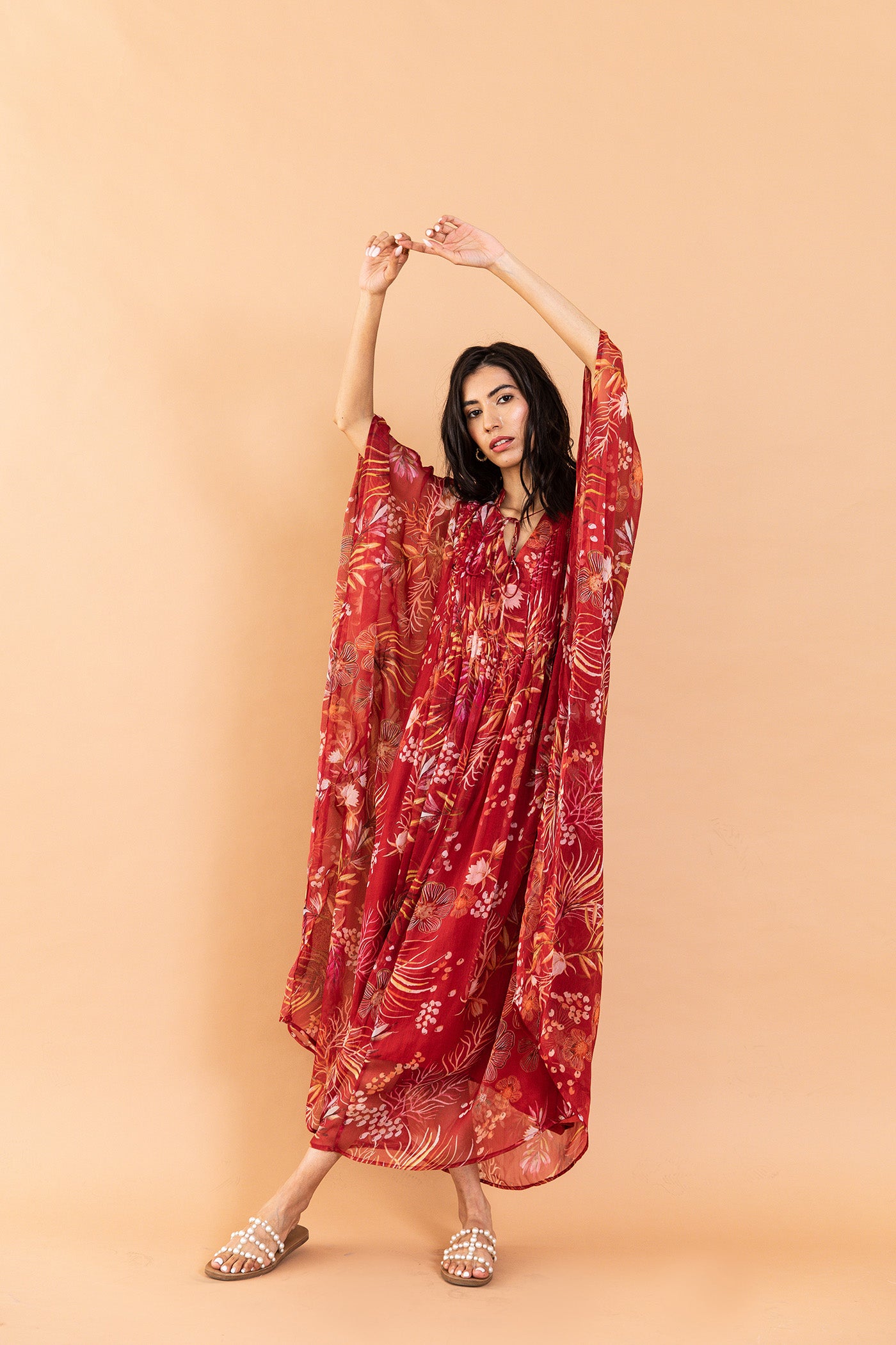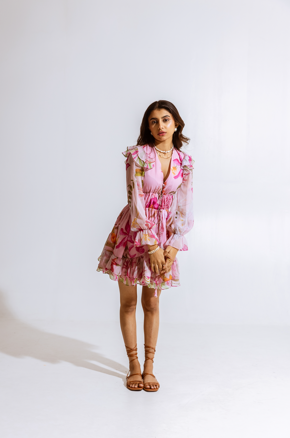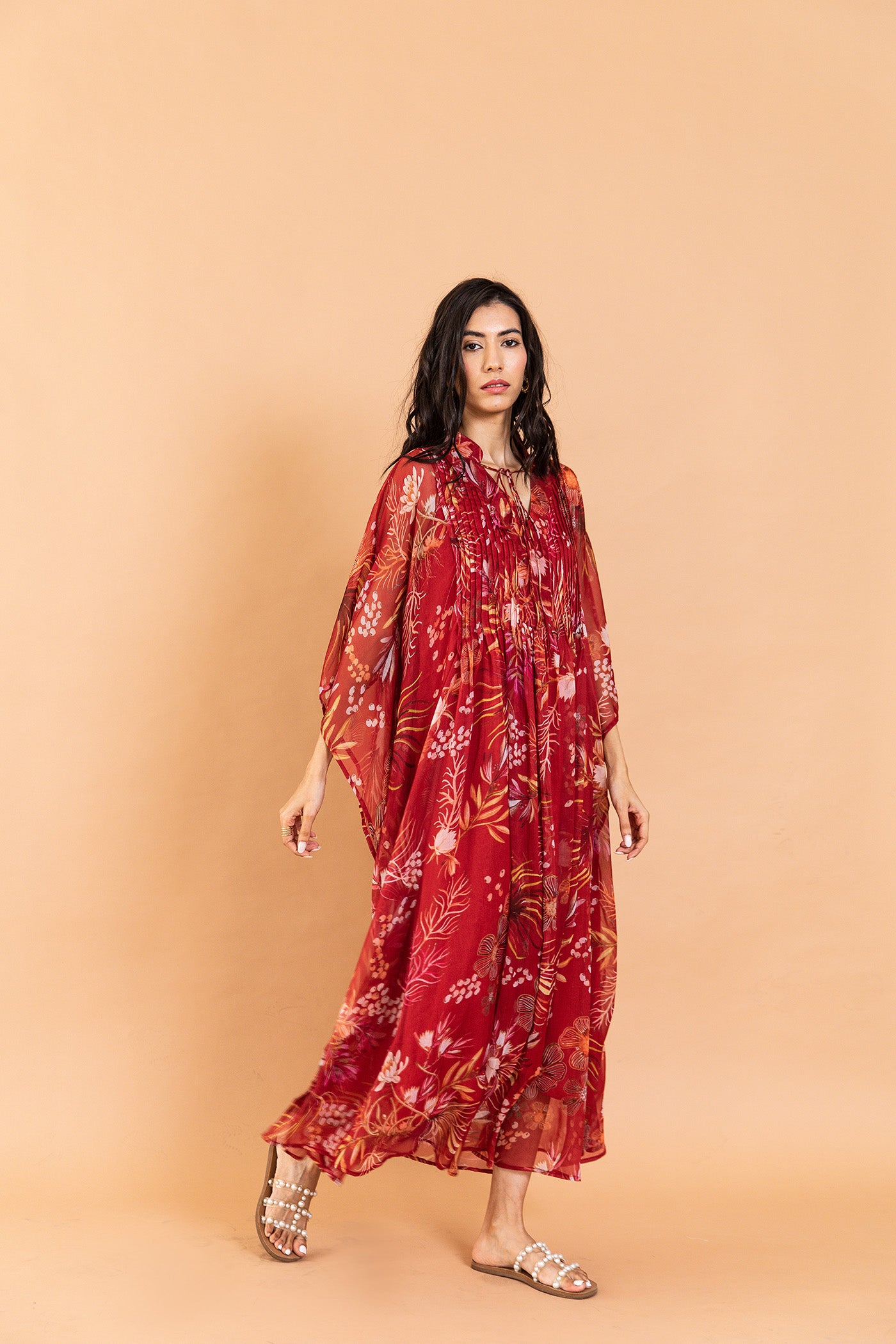 One-shoulder pink pleated asymmetrical top with vibrant floral print, comes with a tube top and flared pants - Perfect for festive celebrations and sundowners.