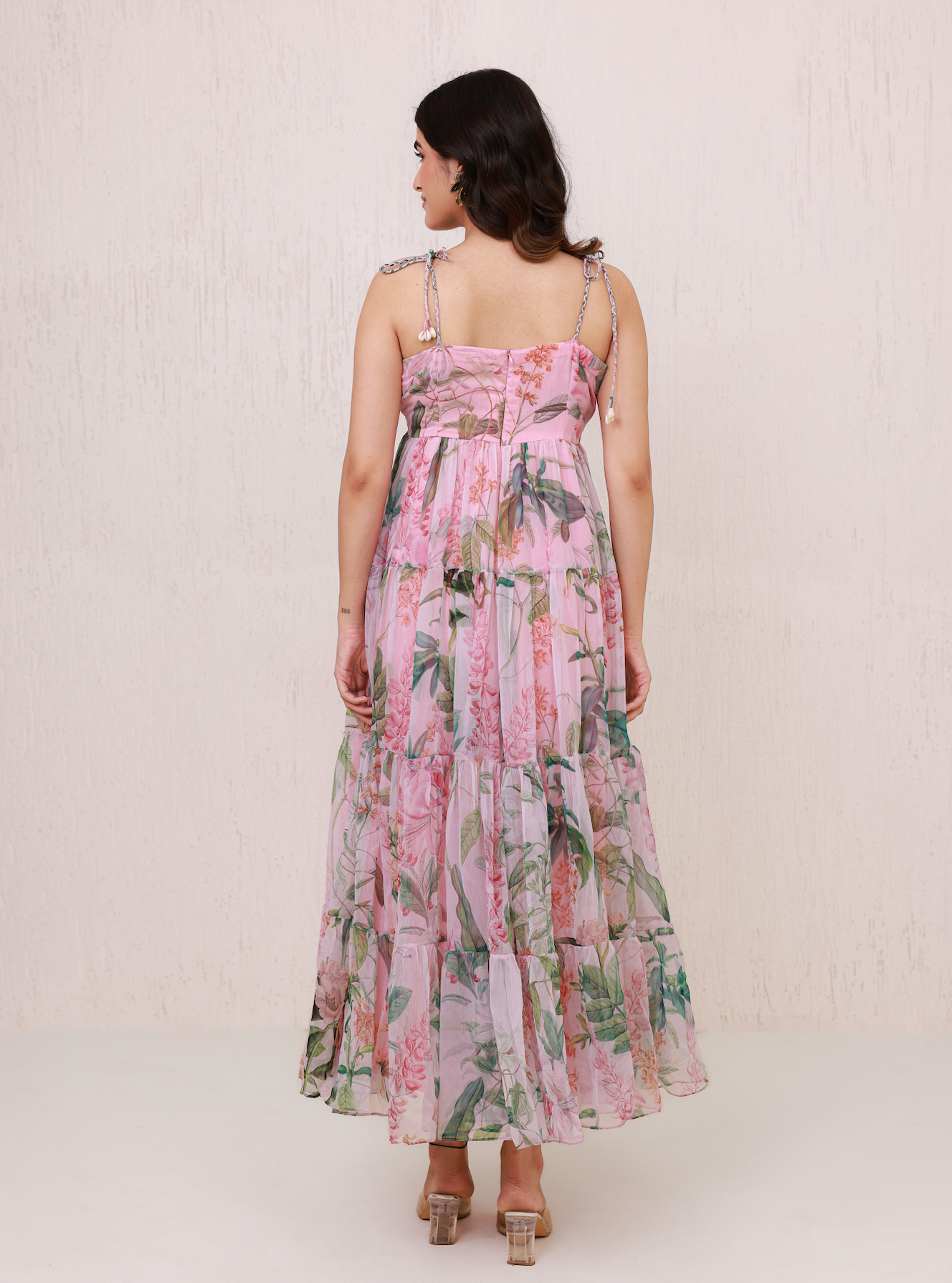 A breezy tiered maxi dress with braided adjustable Tie Yourself straps adorned with cowrie shell details, featuring a soft V - Neckline and flowy foral layers for effortless charm.