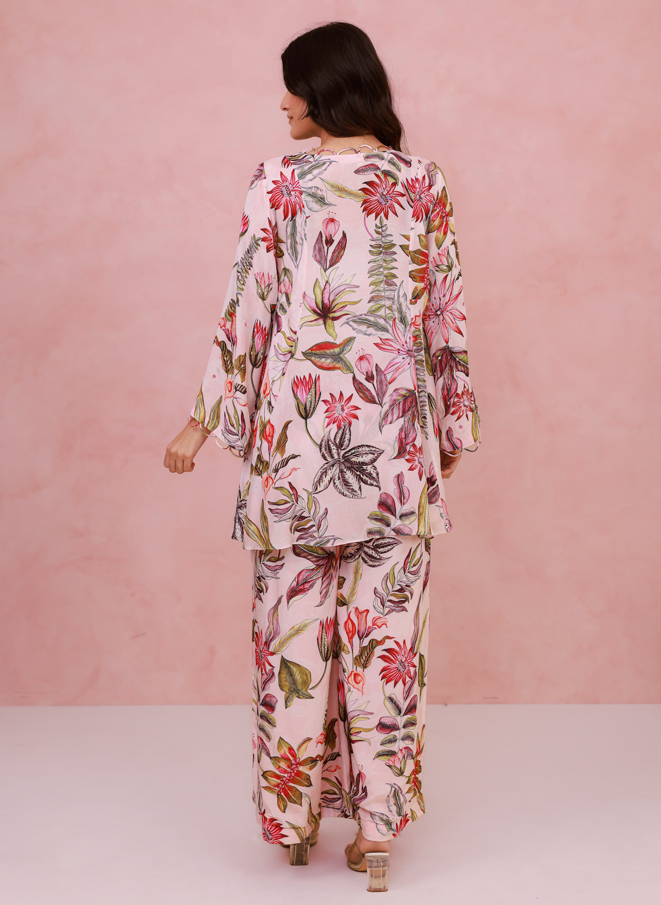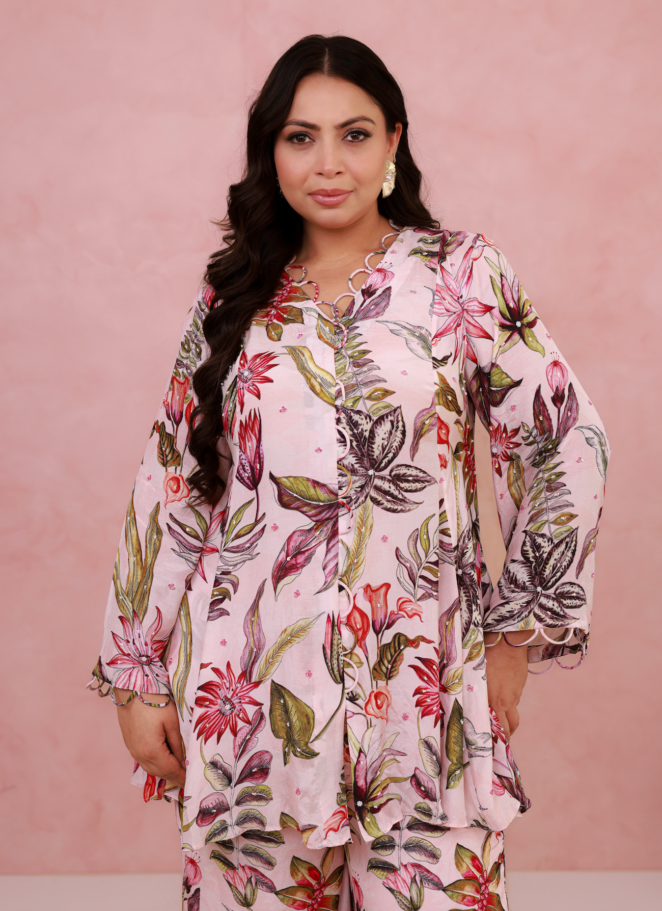 A breezy loose-fit floral co-ord with all-over hand embroidery, finished with piping on the neckline, hem, and an illusion placket for a refined touch.