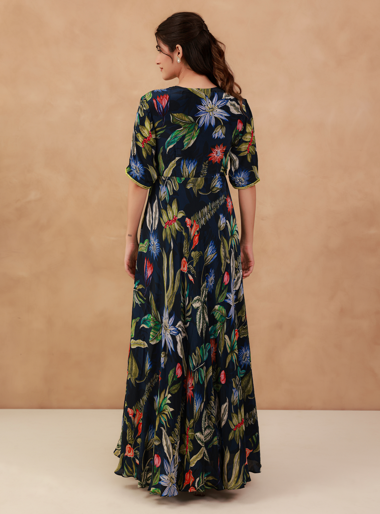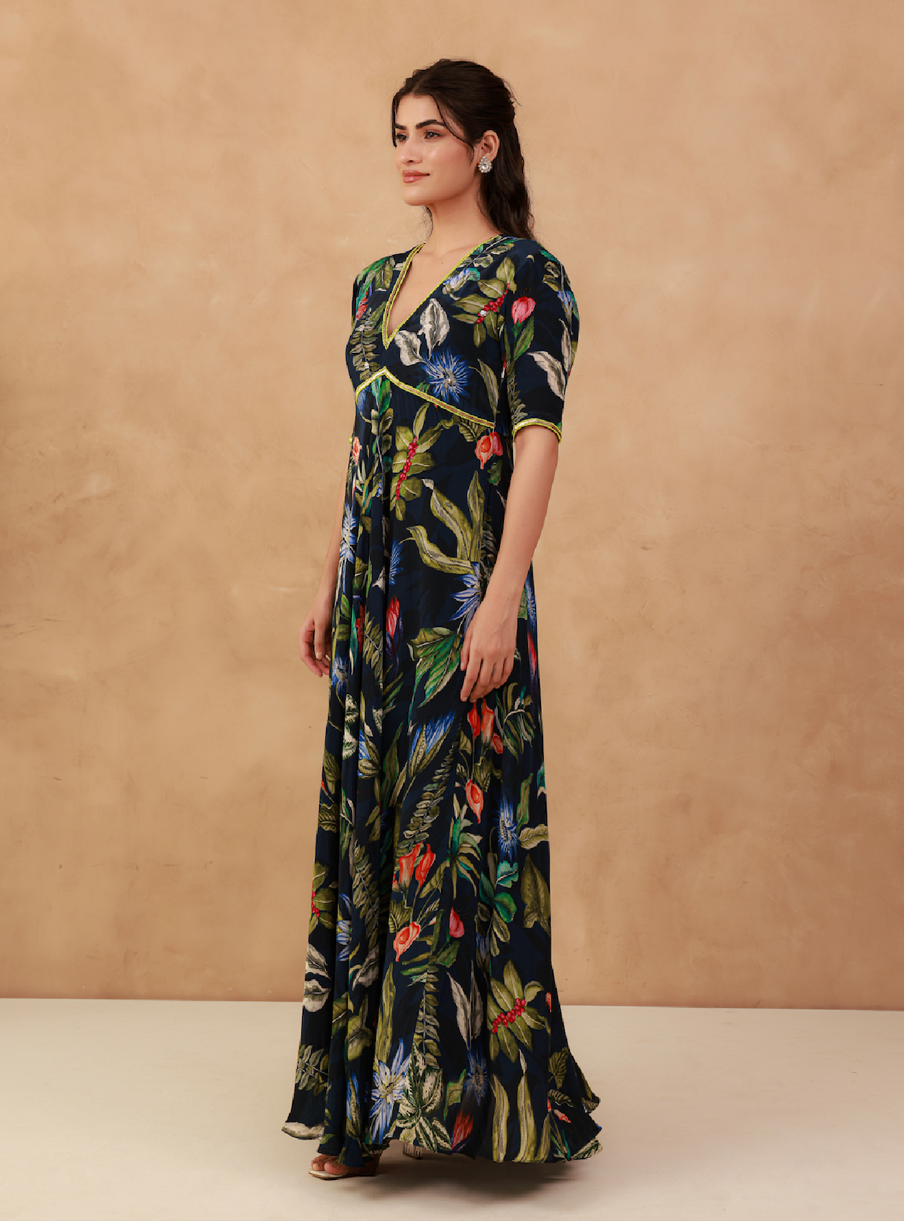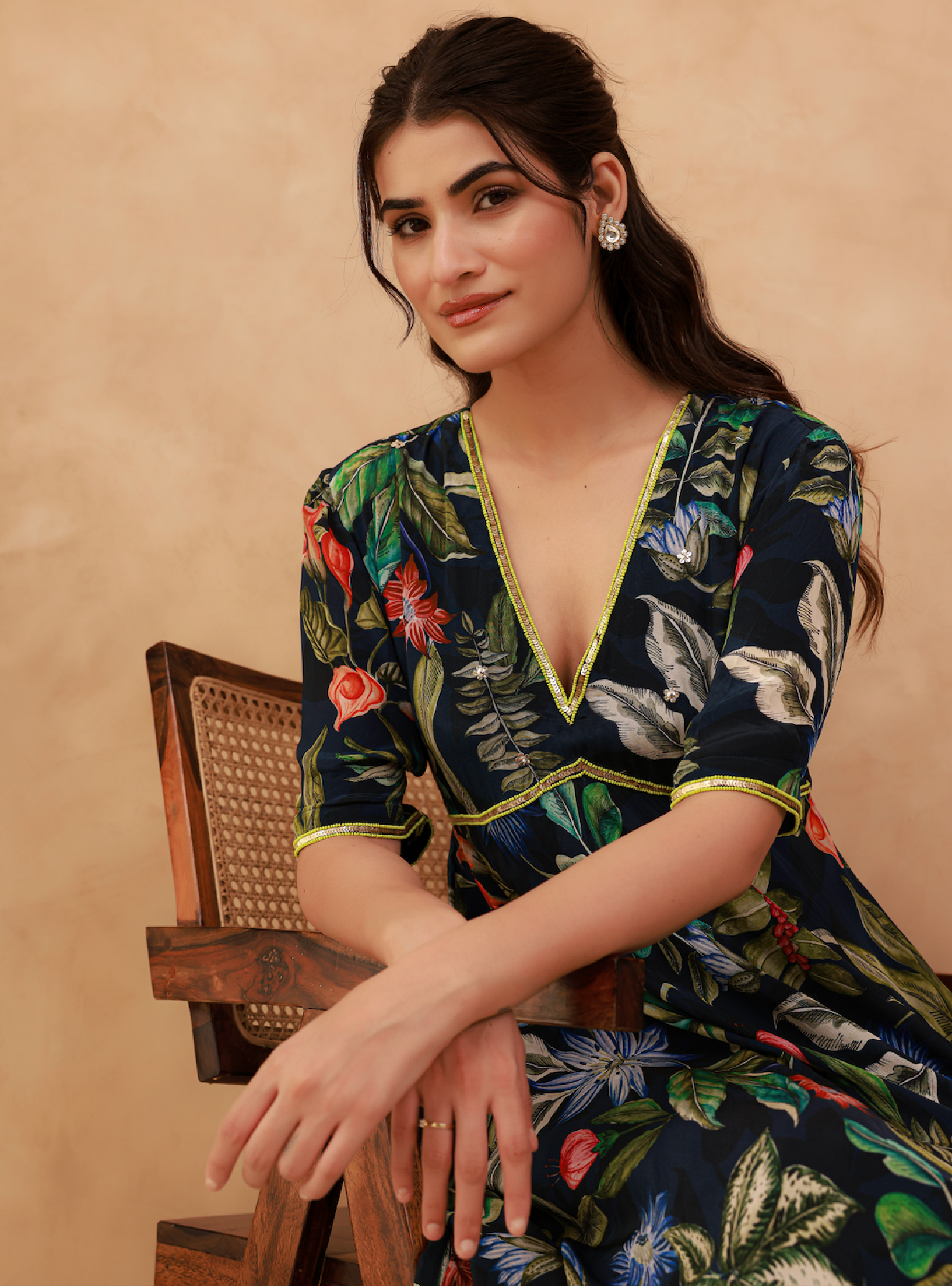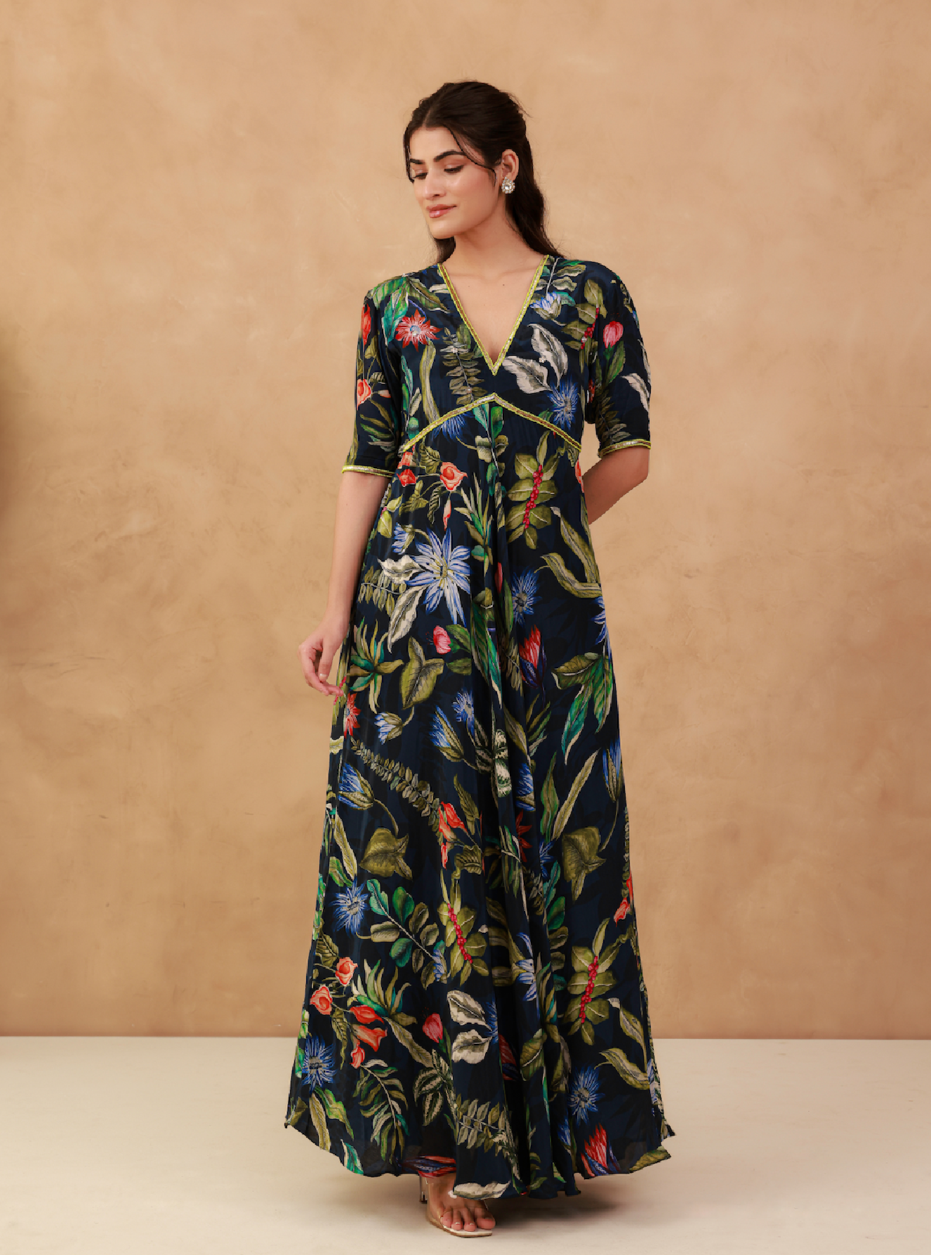A flowy dress featuring an inverted V waistline and deep V neckline, both highlighted with delicate hand-embroidered borders. The elbow-length sleeves are finished with matching embroidered hems, adding subtle elegance to the silhouette.Perfect for festive evenings.