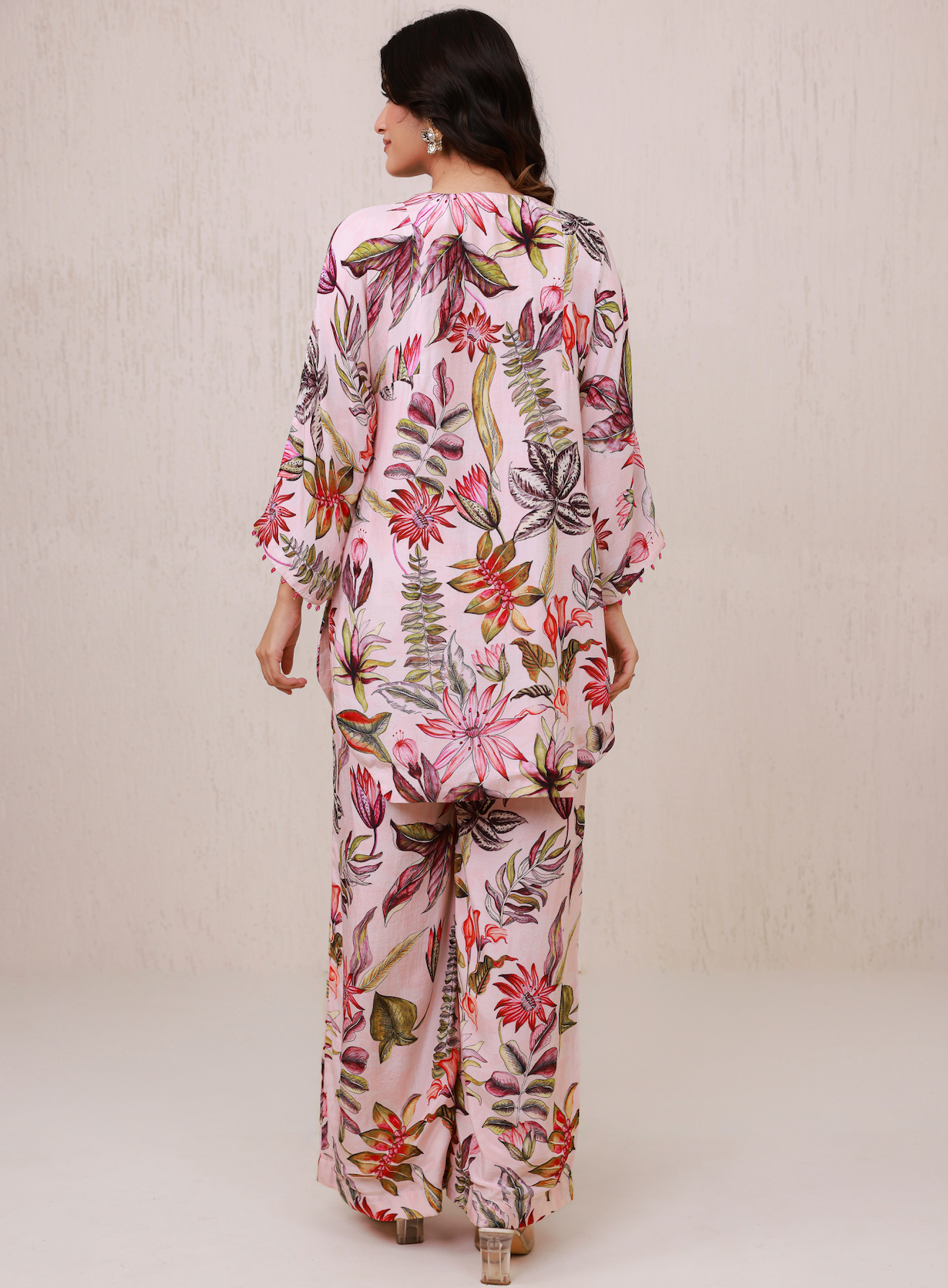 A relaxed fit co-ord set elevated with a hand embroidered neckline and intricately detailed panels of the bodice. Finished with glass bead accents on the sleeve hems, this ensemble blends comfort with delicate handmade charm.