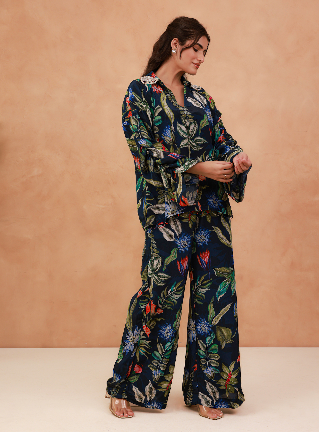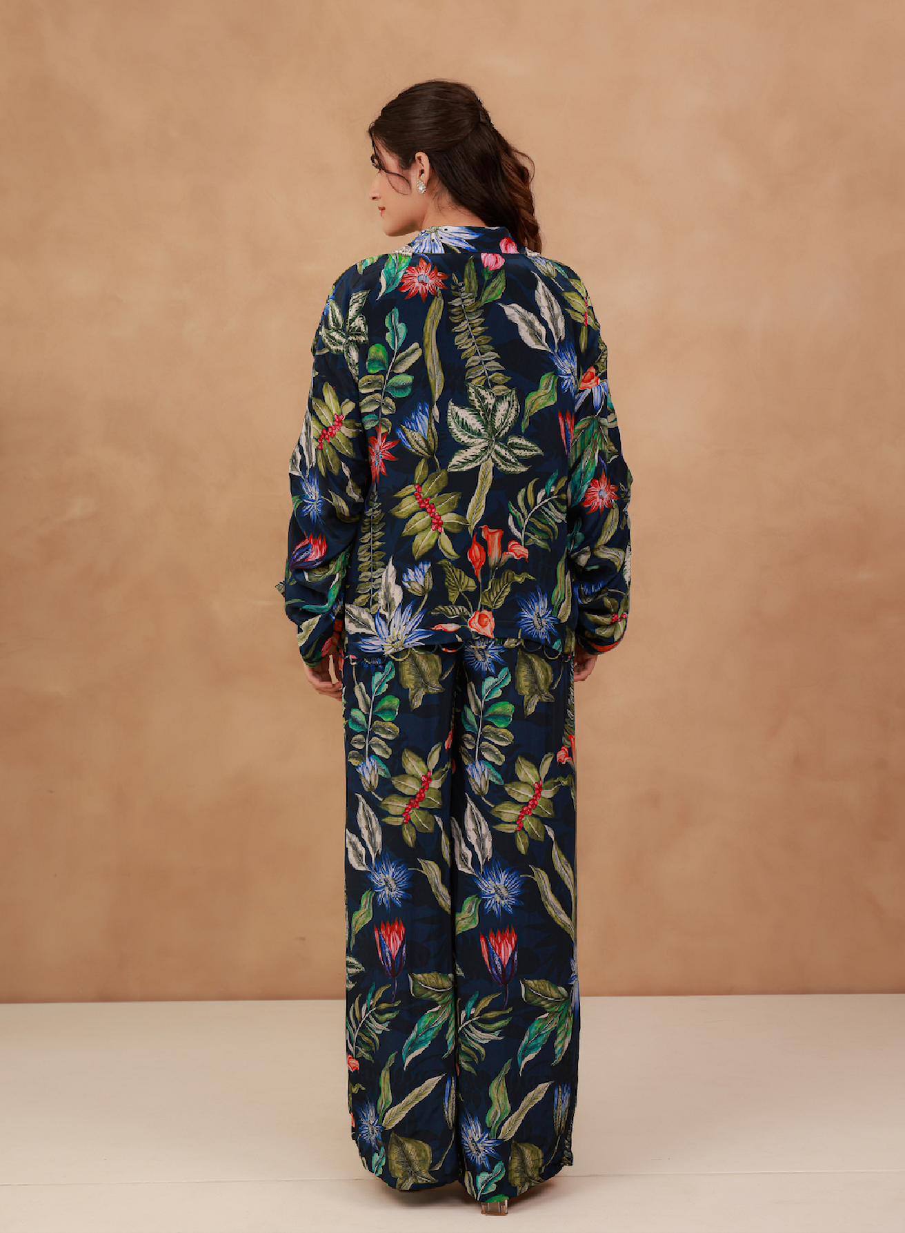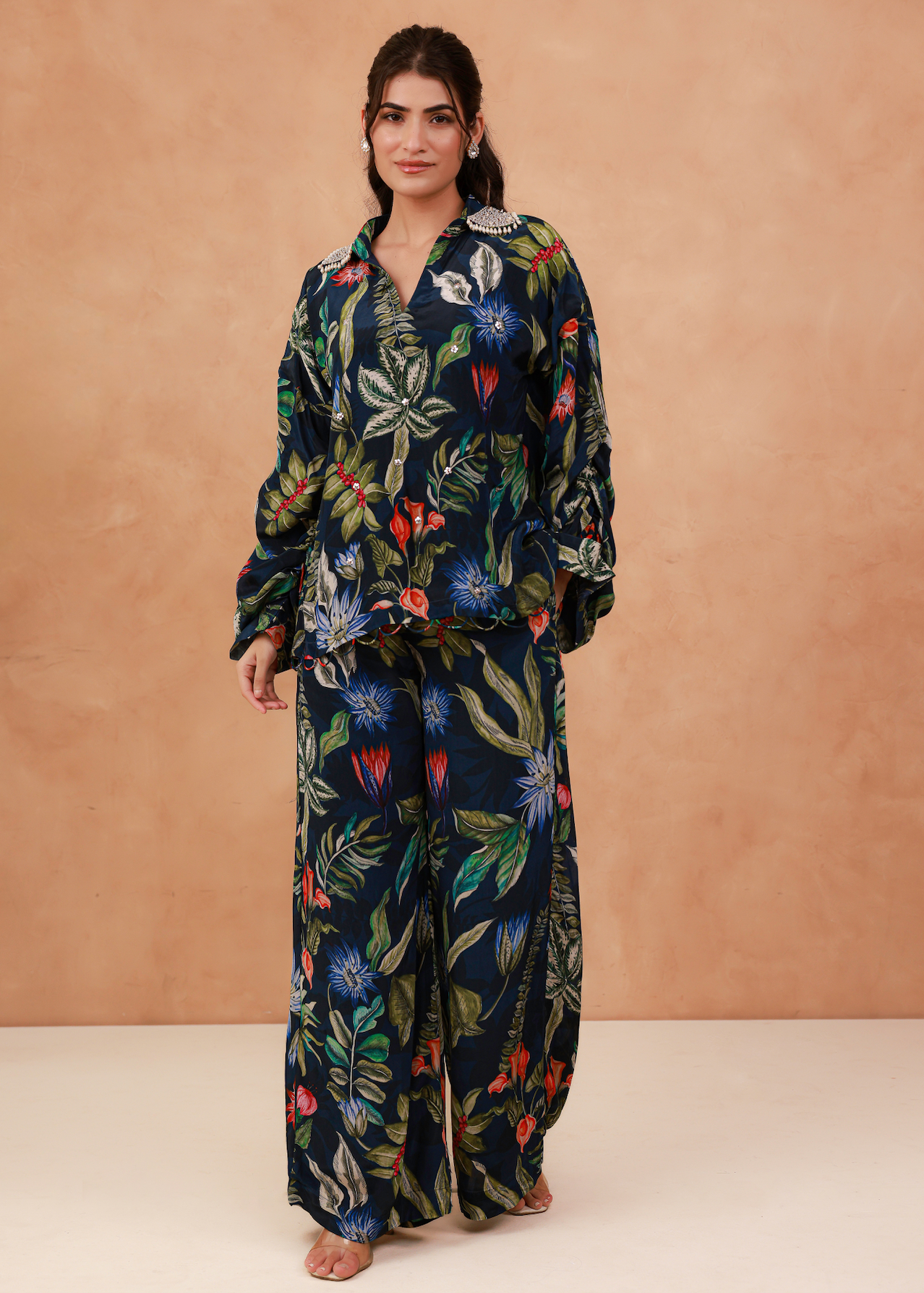 A relaxed-fit co-ord with ruched sleeves and all-over embroidery, finished with a hand-embroidered collar and fabric piping on the hem-where comfort meets statement style.