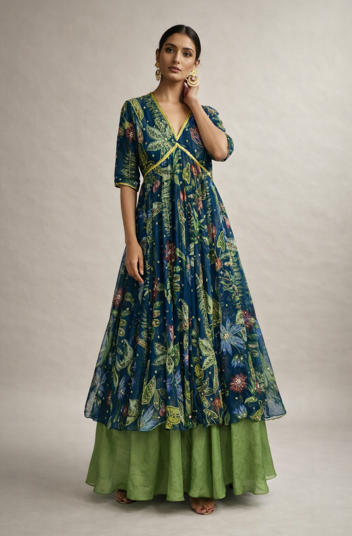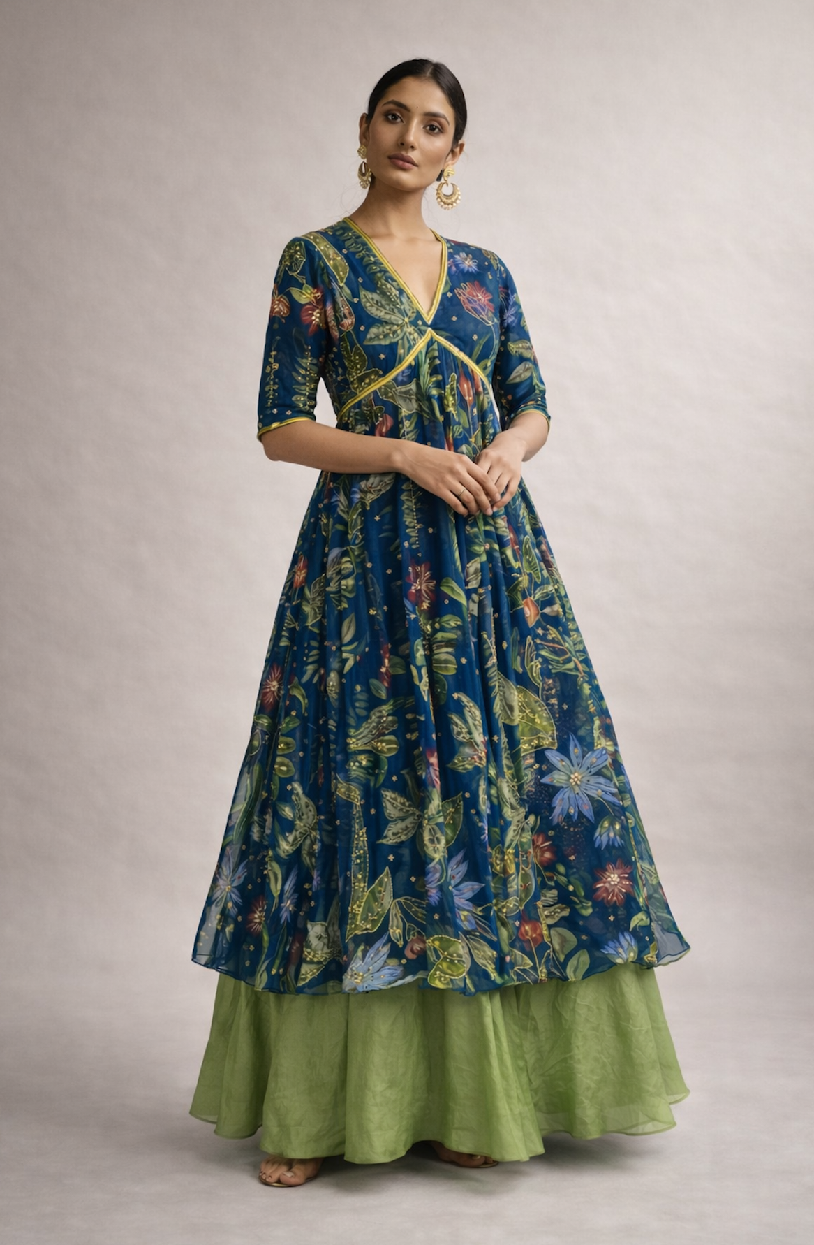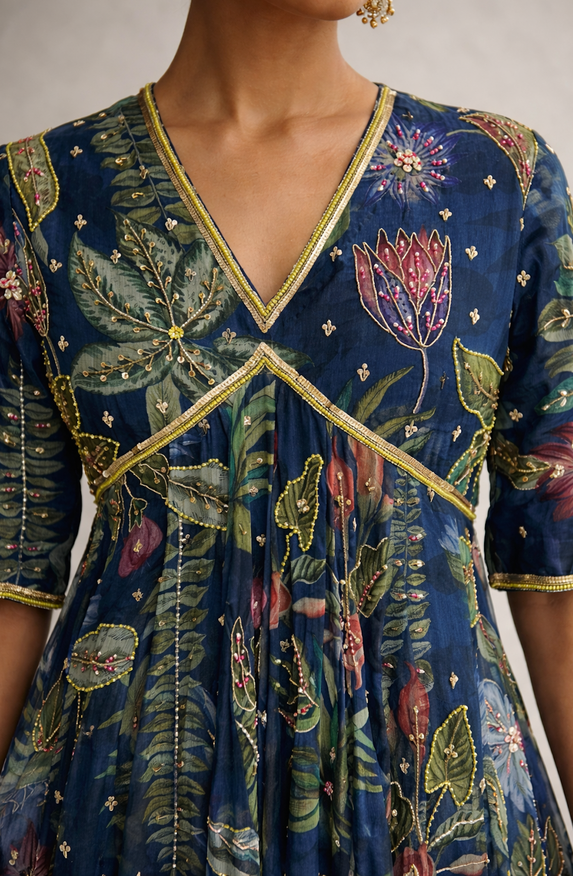 Hand Embroidered V-Neck Floral Flared Kurta with Flared pants.